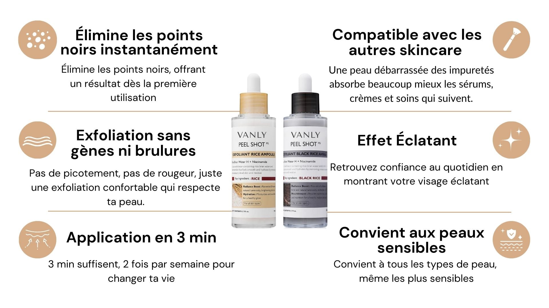 Le Peel Shot Riz Noir est particulièrement efficace pour les peaux à imperfections, car il purifie les pores, aide à réguler la production de sébum et réduit les points noirs. Il est aussi idéal pour les peaux avec de l’acné légère ou des pores obstrués.